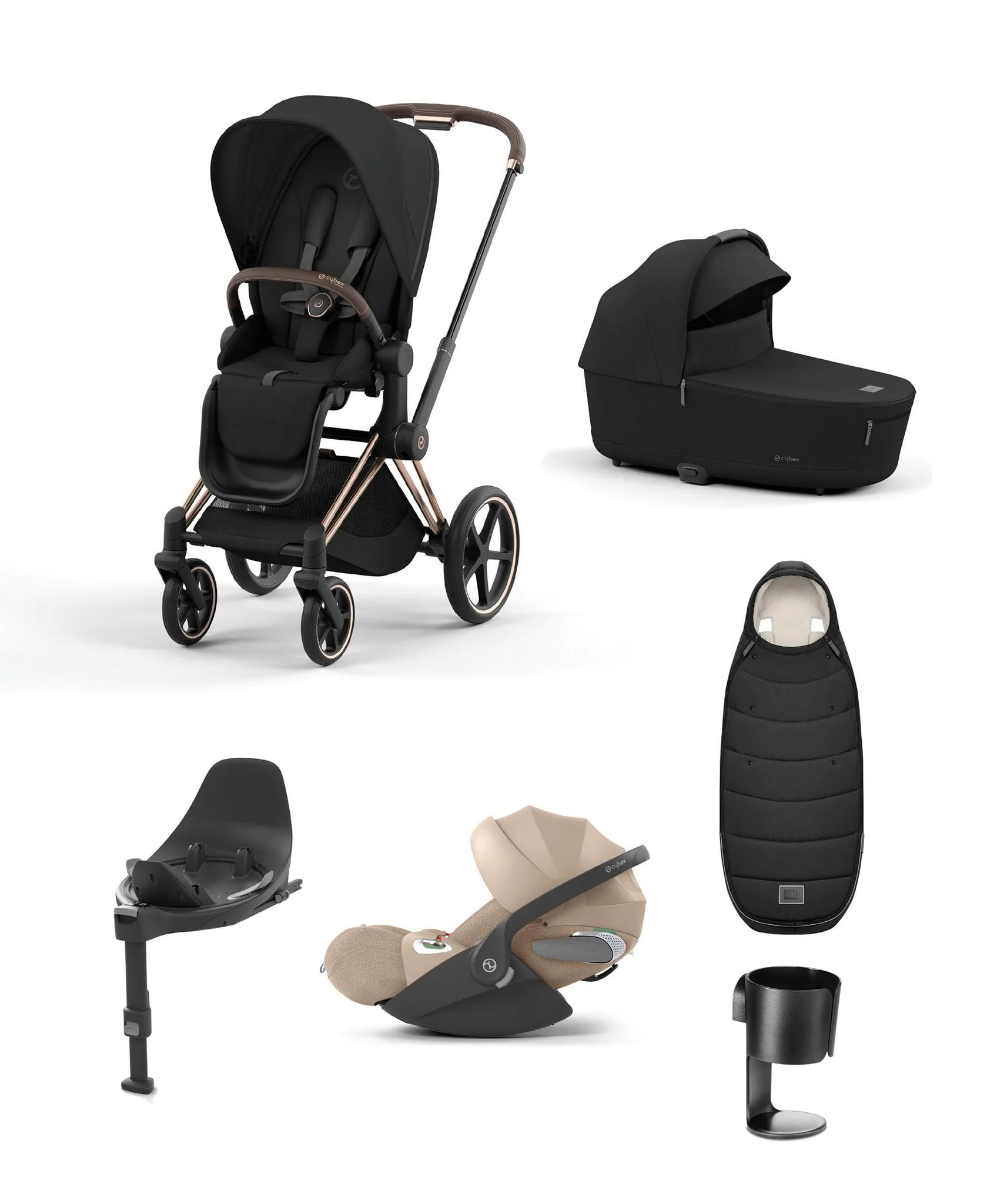 This bundle includes: Cybex E Priam Pushchair Frame/Cybex Priam Seat Pack/Cybex Priam Lux Carrycot/Cybex Platinum Footmuff/Cybex Cloud T i-Size Plus Rotating Baby Car Seat/Cybex Base T 360° Rotating ISOFIX Car Seat Base/Cybex 2in1 Cupholder.