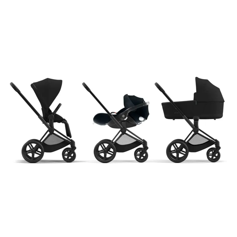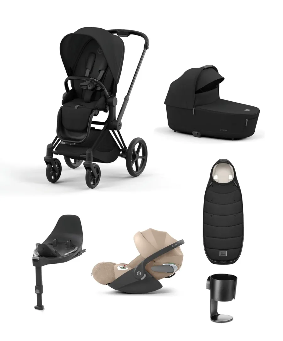 This bundle includes: Cybex Priam Pushchair Frame, Cybex Priam Seat Pack, Cybex Priam Lux Carrycot, Cybex Platinum Footmuff, Cybex Cloud T i-Size Plus Rotating Baby Car Seat, Cybex Base T 360° Rotating ISOFIX Car Seat Base, Cybex 2in1 Cupholder.